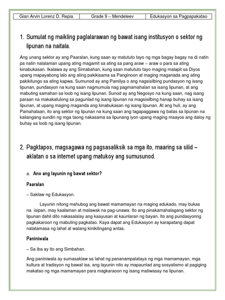 Edukasyon sa Pagpapakatao 08112020 0855 HaHannah. Ano Ang layunin Ng bawat sektor. Add your answer and earn points.