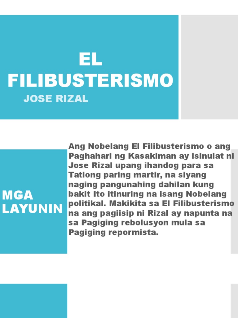 Ang El Filibusterismo o tinatawag ding Paghahari ng Kasakiman ay isinulat ni Jose Rizal para sa tatlong paring martin na GOMBURZA ang nasabing nobela ay pampulitika ana ang layunin ay nagpapadama nagpapahiwatig at nagpapagising pang lalo sa maalab na hangaring. SI SIMOUN Kabanata VII 2. Ang layunin ni Jose Rizal sa pagsusulat ng El Filibusterismo na kilala bilang Reign of Greed sa Ingles ay upang mapukaw ang rebolusyonaryong damdamin ng mga Pilipino.