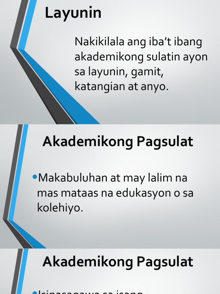 Kahulugan At Kalikasan Ng Akademikong Pagsulat By Ivan Ileto. Narito ang tatlong3 layunin ng mga kwento tungkol sa sa pinanggalingan ng mga bagay-bagay. Ang layunin ng akademikong pagsulat ay pataasin ang antas ng kaalaman ng mga mag-aaral sa pagbasa at pagsulat sa ibat ibang disiplina o larang.