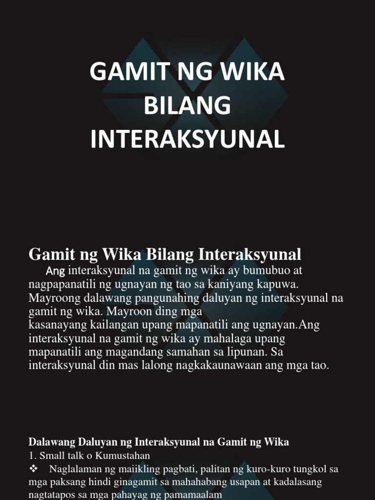 Ang interaksyonal ay tungkulin na nakapagpapanatili o nakapagpapatatag ng relasyong sosyal. Gampanin Ng Wika Halimbawa At Kahulugan Ng Mga Ito. Sa paksang ito tatalakayin natin ang gamit at tungkuling nito.